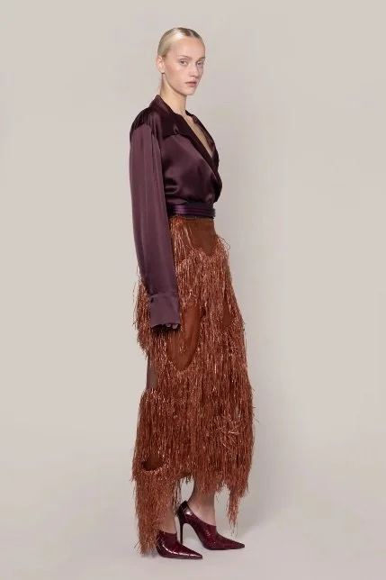 The collection itself is breath-taking. Dramatic coats, fluid gowns, and sharply tailored pieces move between softness and strength. Silks and flowing fabrics create dresses that seem to float with every step, while structured outerwear brings grounding and architectural power. Colours are rich and uplifting, deep jewel tones, warm neutrals, and sudden bursts of brightness remind us that winter need not be dark. Even the textures tell their own story; raffia fringes, pleated details, and sculptural silhouettes lend the clothes a tactile, almost living quality.