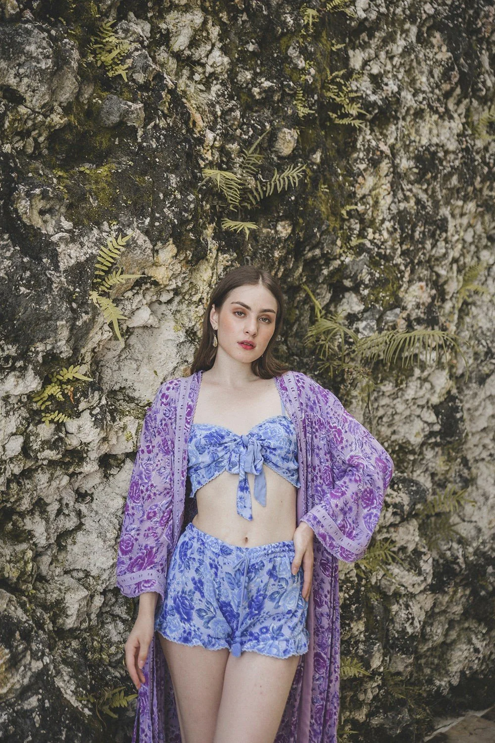 Peony, Long Robe in Violet, Peony, Bandeau Top in Ibiza Blue & Peony, Frill Shorts in Ibiza Blue